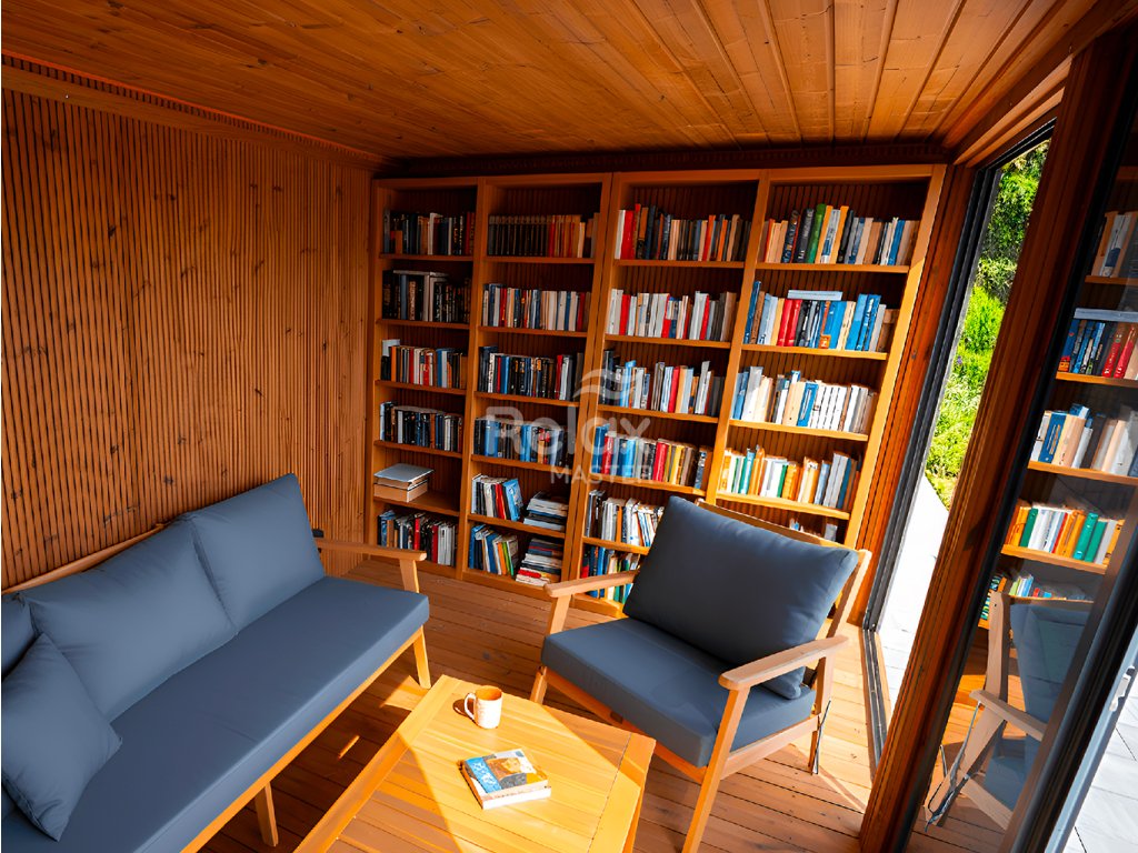 Fasáda je tvořena lamelami z termované borovice o tloušťce 26 mm, které jsou rozměrově stabilní, odolné vůči vlhkosti i škůdcům a zároveň působí velmi elegantně. Termované dřevo nevyžaduje náročnou údržbu a skvěle zapadne do každé zahrady.