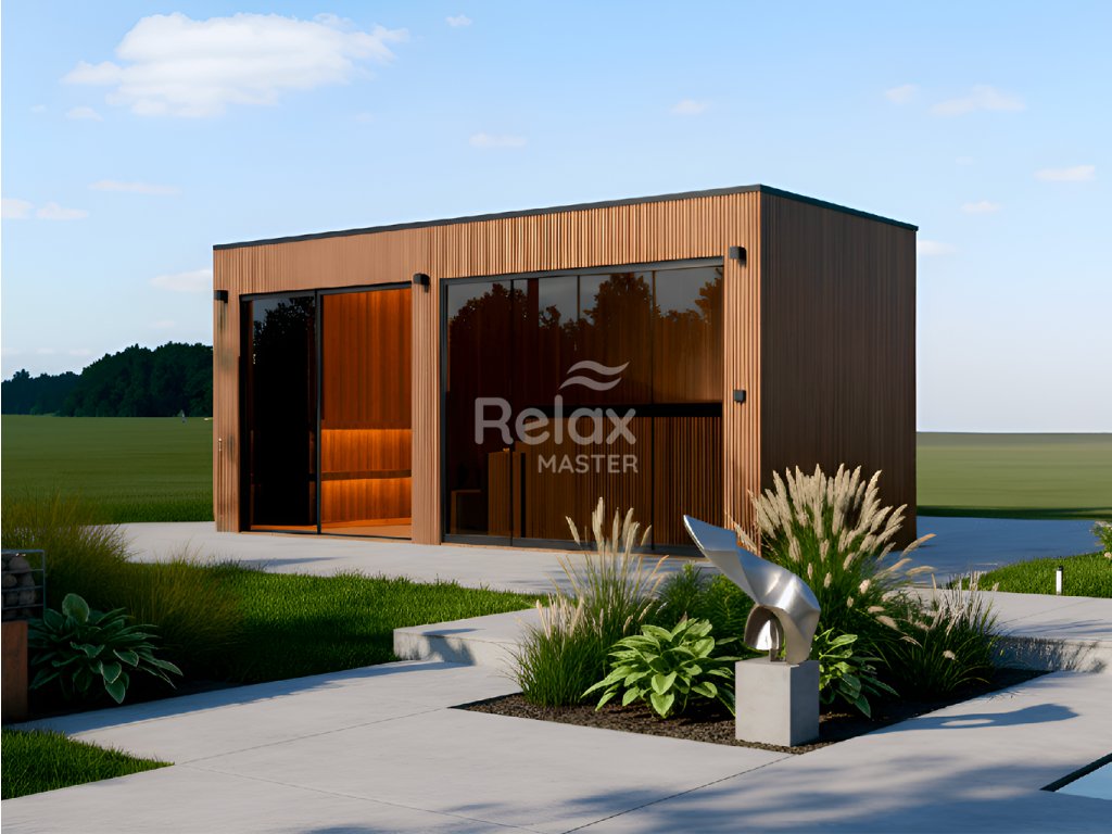 Vnější fasáda je tvořena lamelami z termované borovice o tloušťce 26 mm. Termované dřevo se vyznačuje vysokou rozměrovou stálostí, odolností proti vlhkosti, hnilobě a škůdcům a zároveň minimálními nároky na údržbu.