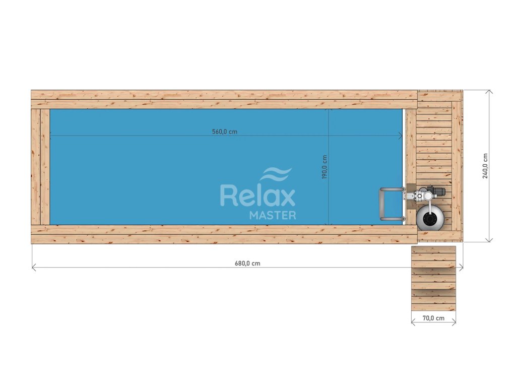 Díky vnitřním rozměrům 560 × 190 cm a objemu cca 10 640 litrů poskytuje bazén dostatek místa pro plavání, relaxaci i rodinnou zábavu. Vnitřní výška 100 cm je ideální pro děti i dospělé.