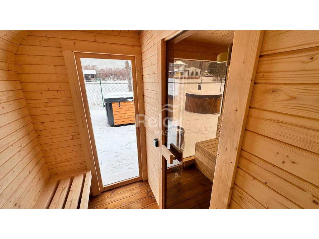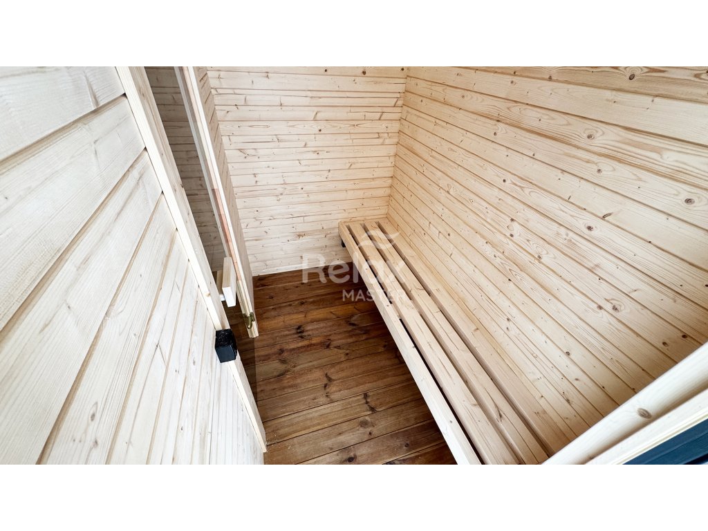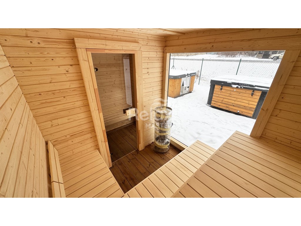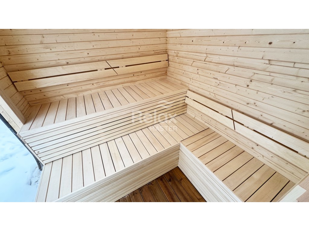 Materiál sauny: Vyrobená ze smrkového nebo z termo dřeva, které je odolné vůči vlhkosti a změnám teploty, což zajišťuje dlouhou životnost a nízké nároky na údržbu