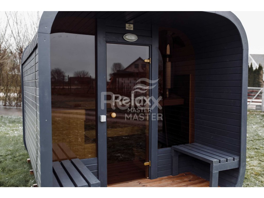 Drzwi i okna wykonane są ze szkła hartowanego, które jest bezpieczne i jednocześnie przepuszcza wystarczającą ilość naturalnego światła do sauny.