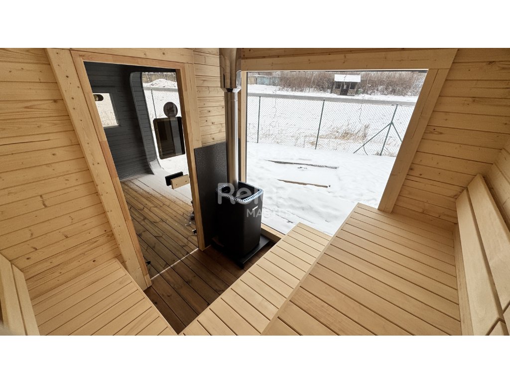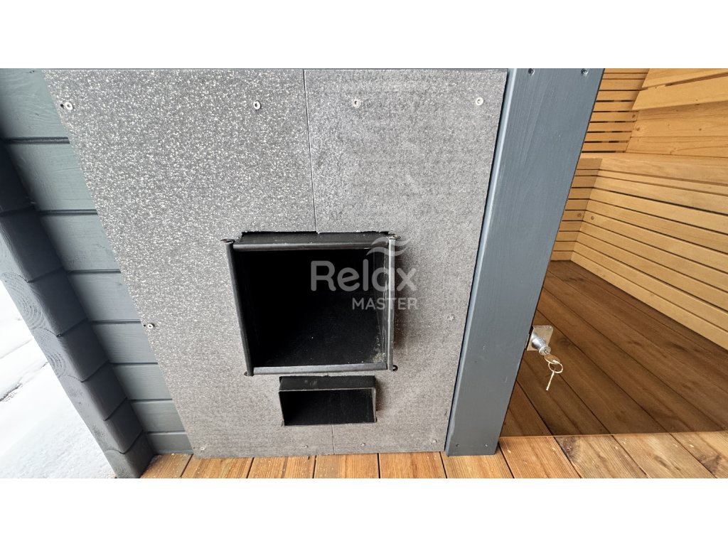 Sauna wyposażona jest w piec na drewno z zewnętrznym podkładaniem, który zapewnia autentyczne fińskie saunowanie i przyjemną atmosferę. Idealna dla wszystkich, którzy szukają połączenia sauny i wanny z hydromasażem dla domowego wellness, relaksu i regeneracji ciała oraz umysłu.