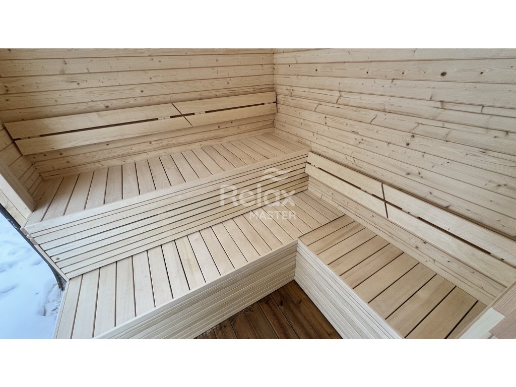 Sauna wykonana jest ze świerku lub drewna termicznego, z zewnętrzną ścianą o grubości 44 mm. Ławki są z naturalnej lipy, podłoga z desek tarasowych. Dach pokryty jest gontem bitumicznym, kolor można dopasować według własnych upodobań.
