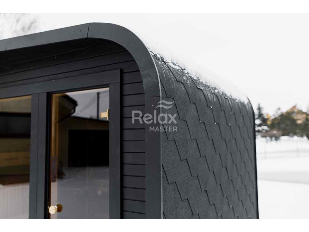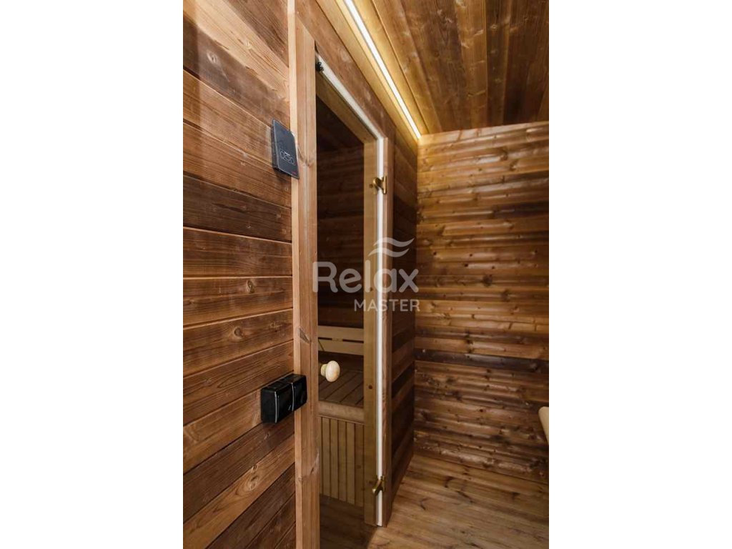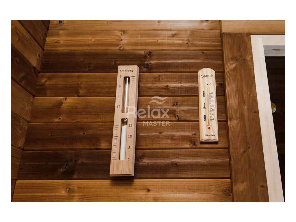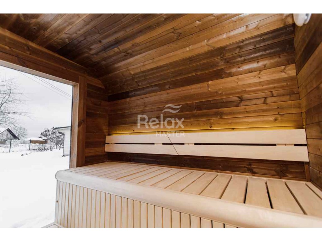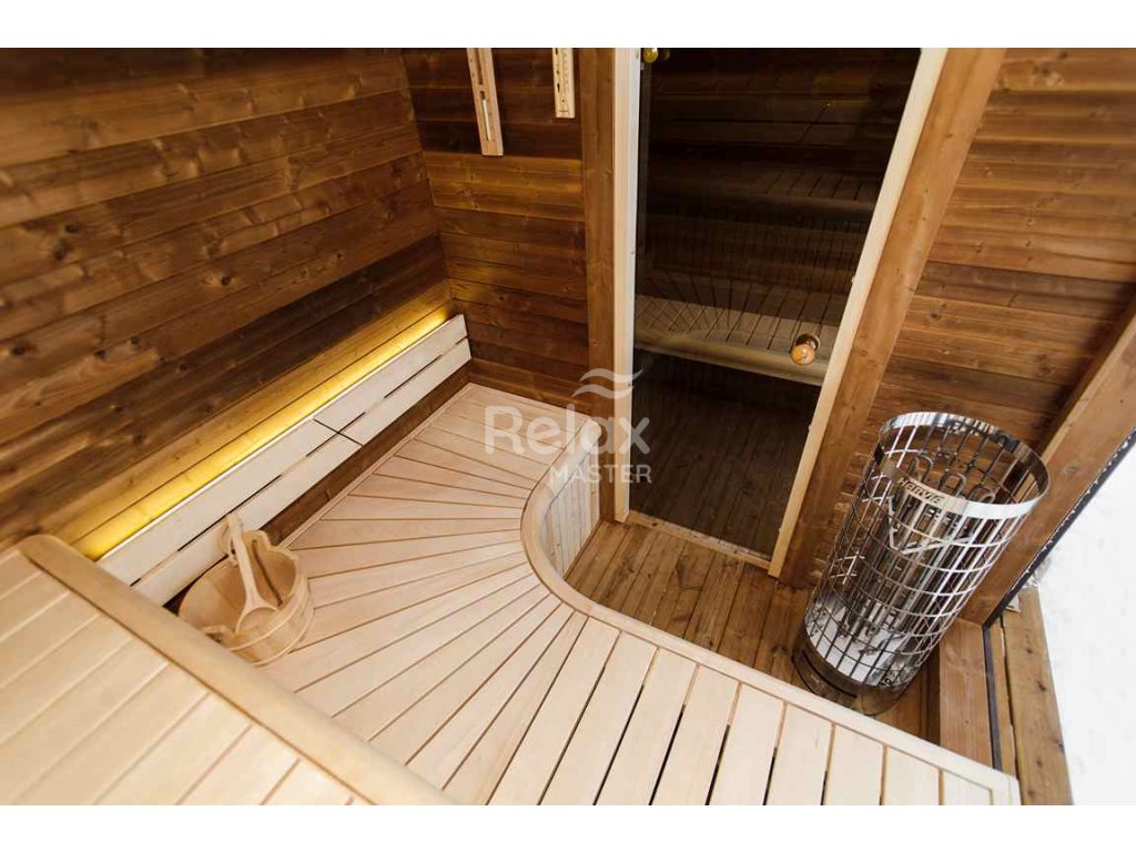 Zewnętrzna fińska sauna izolowana LUX z przedpokojem 245×340 – drewno termoizolacyjne