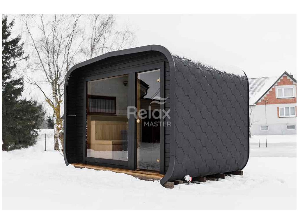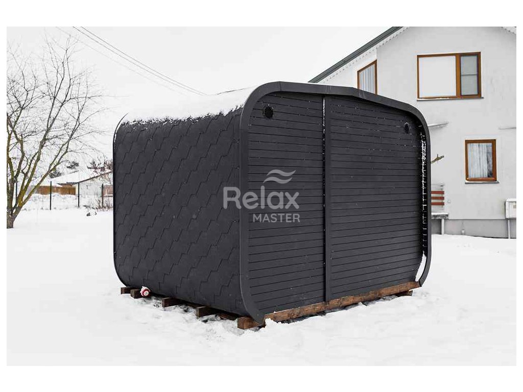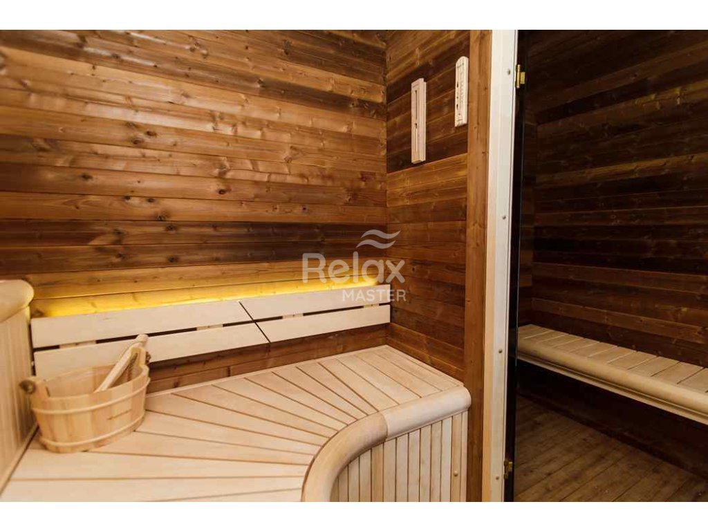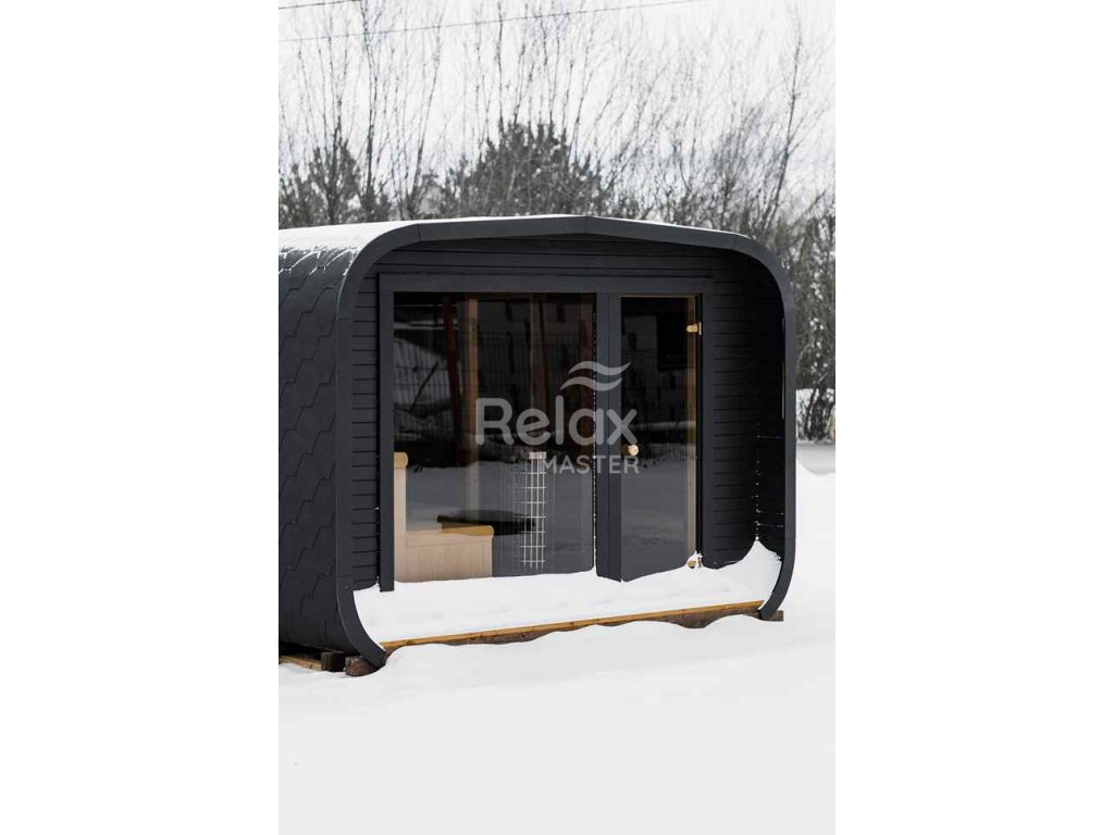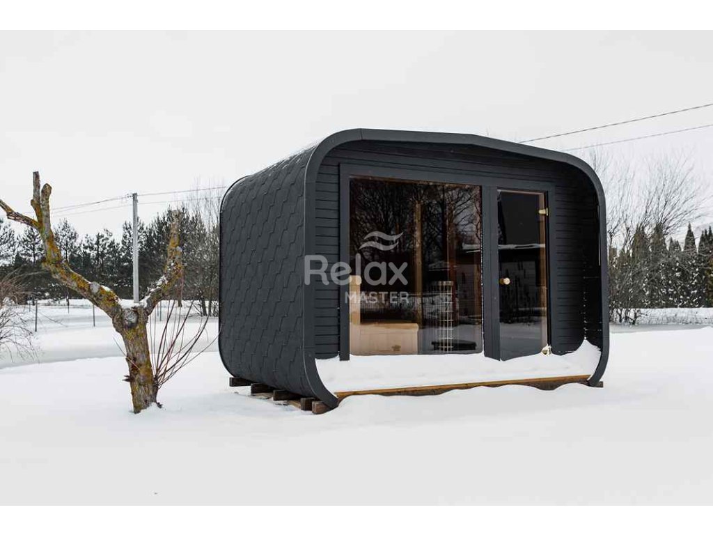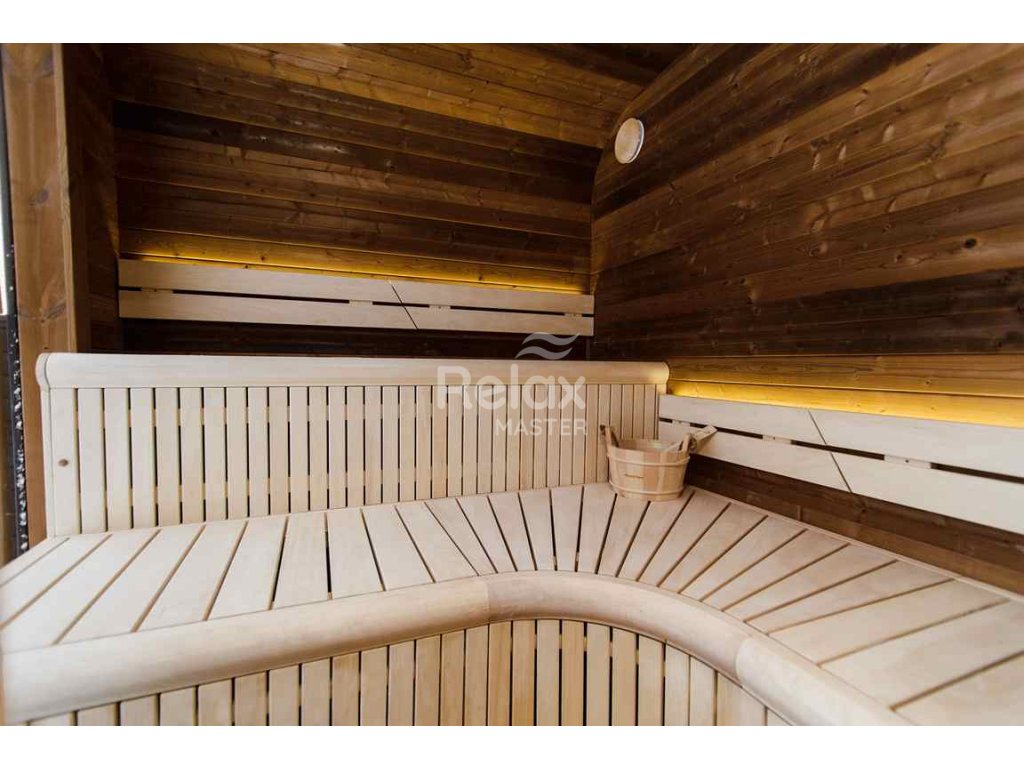 Zewnętrzna fińska sauna izolowana LUX z przedpokojem 245×340 – drewno termoizolacyjne