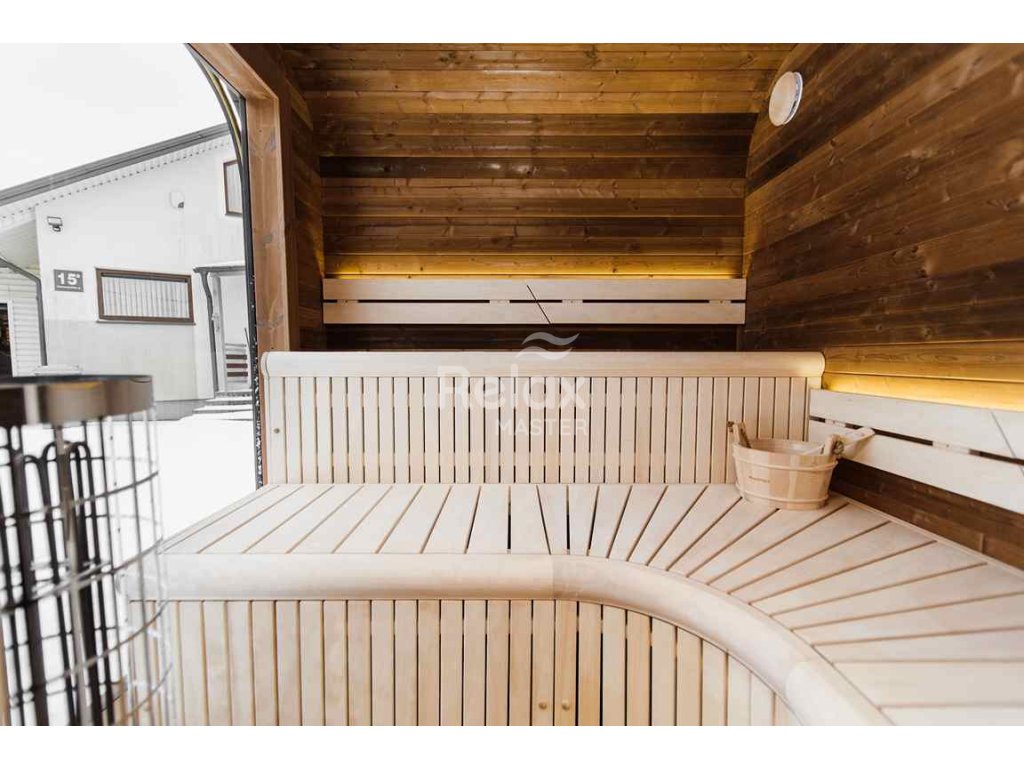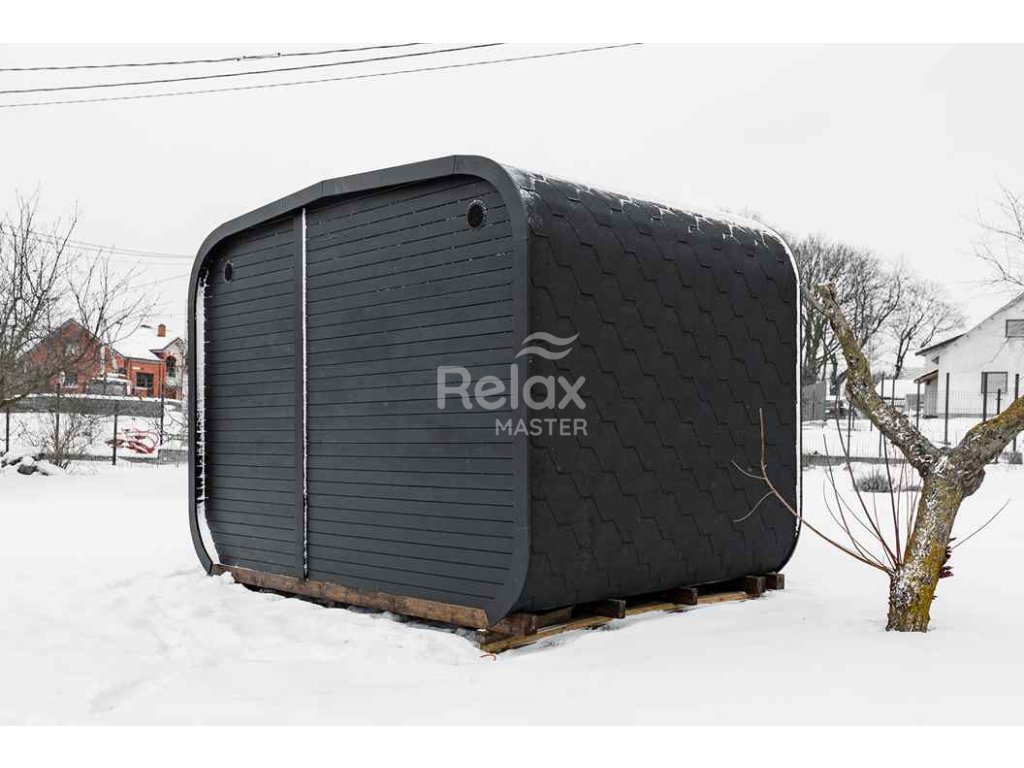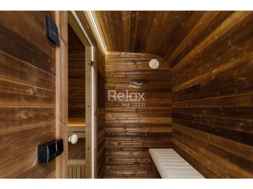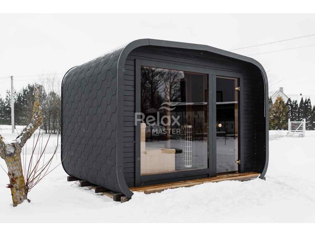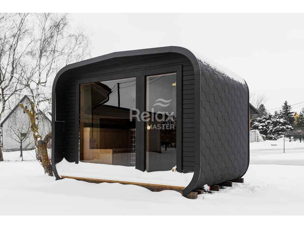 Zewnętrzna fińska sauna izolowana LUX z przedpokojem 245×340 – drewno termoizolacyjne