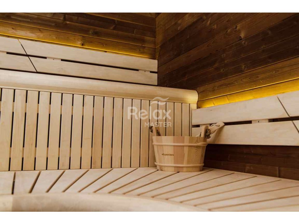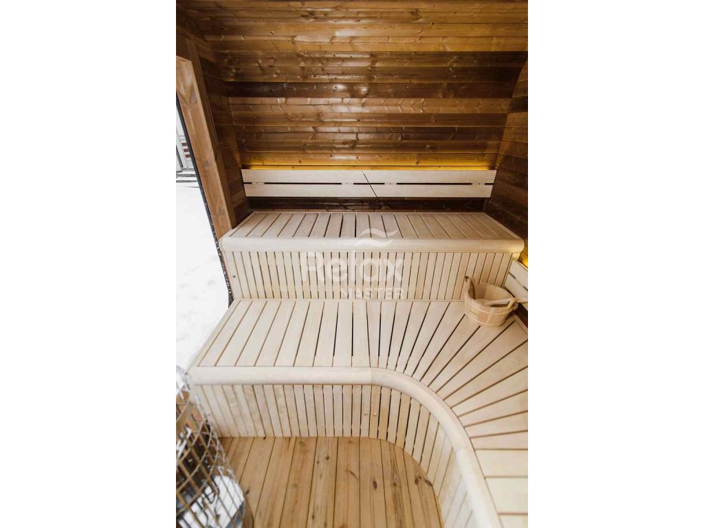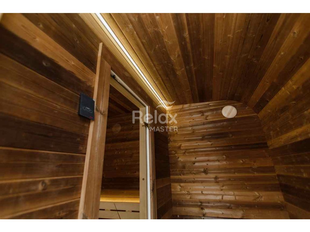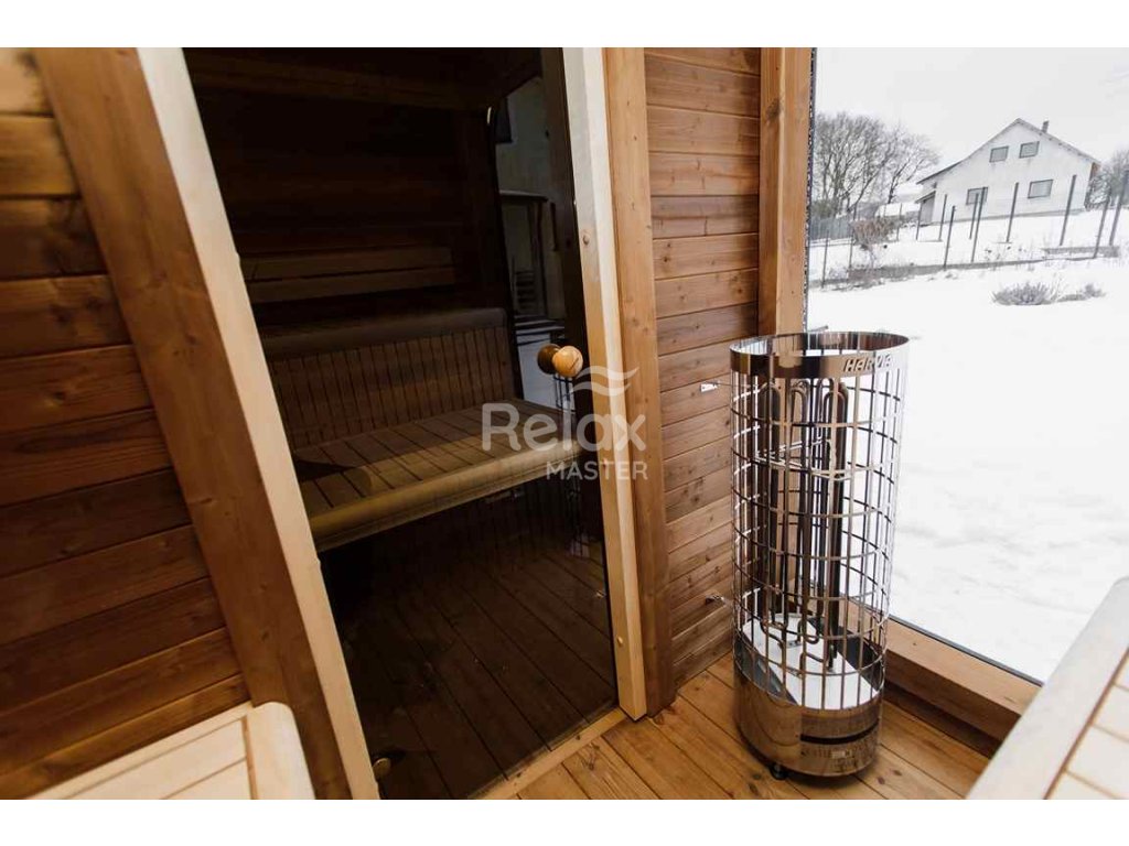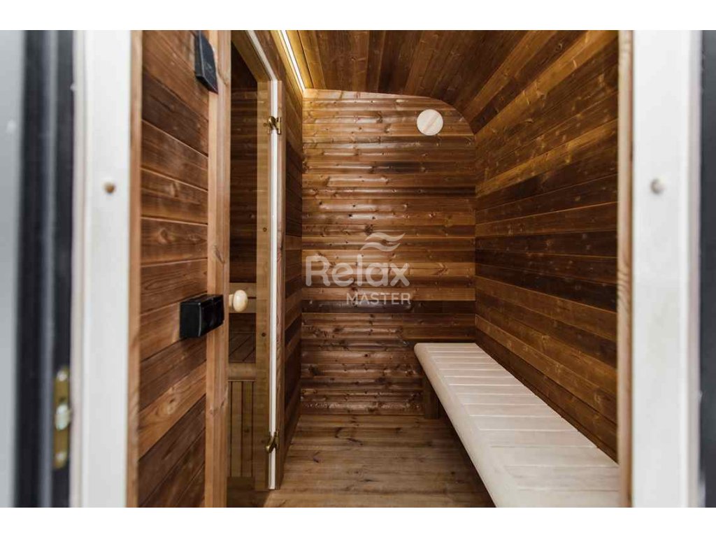 Wysokiej jakości sauna wykonana ze świerkowego drewna termicznego oferuje doskonały relaks i korzyści zdrowotne dla ciała i umysłu. Dzięki przemyślanej izolacji z 5 cm wełny mineralnej PAROC sauna jest doskonale ocieplona, co zapewnia długotrwałe ciepło i oszczędność energii. Solidna konstrukcja z 44-milimetrową zewnętrzną ścianą gwarantuje wytrzymałość i odporność na wiele lat. Wygodne leżanki z drewna lipowego nadają naturalny i przyjemny charakter podczas korzystania z sauny. Podłogi wykonane są z wysokiej jakości tarasowych desek termicznych, które są odporne na wilgoć i łatwe w utrzymaniu. Dach pokryty gontem bitumicznym zapewnia ochronę i estetyczny wygląd, a kolor można dobrać według własnych preferencji. Sauna wyposażona jest w skuteczną wentylację, która utrzymuje przyjemny i zdrowy klimat. Instalacja elektryczna obejmuje nowoczesne oświetlenie z 2 oryginalnymi lampami Harvia, tworzącymi przyjemną atmosferę. Bezpieczeństwo i styl gwarantują drzwi oraz okna z hartowanego szkła. Kolor sauny można dostosować dokładnie do własnego gustu i wnętrza. Czas realizacji wynosi od 6 do 8 tygodni, po czym dostarczymy w pełni zmontowaną saunę wraz z zamontowanym i podłączonym piecem oraz wysokiej jakości kamieniami lawowymi.