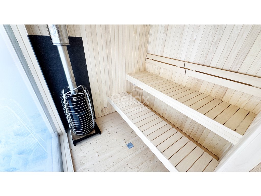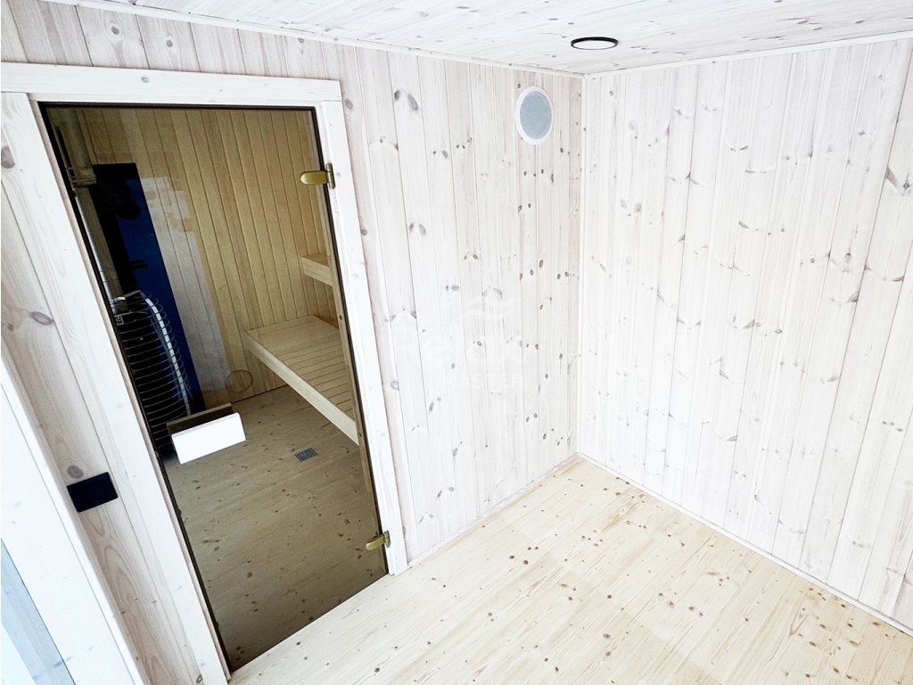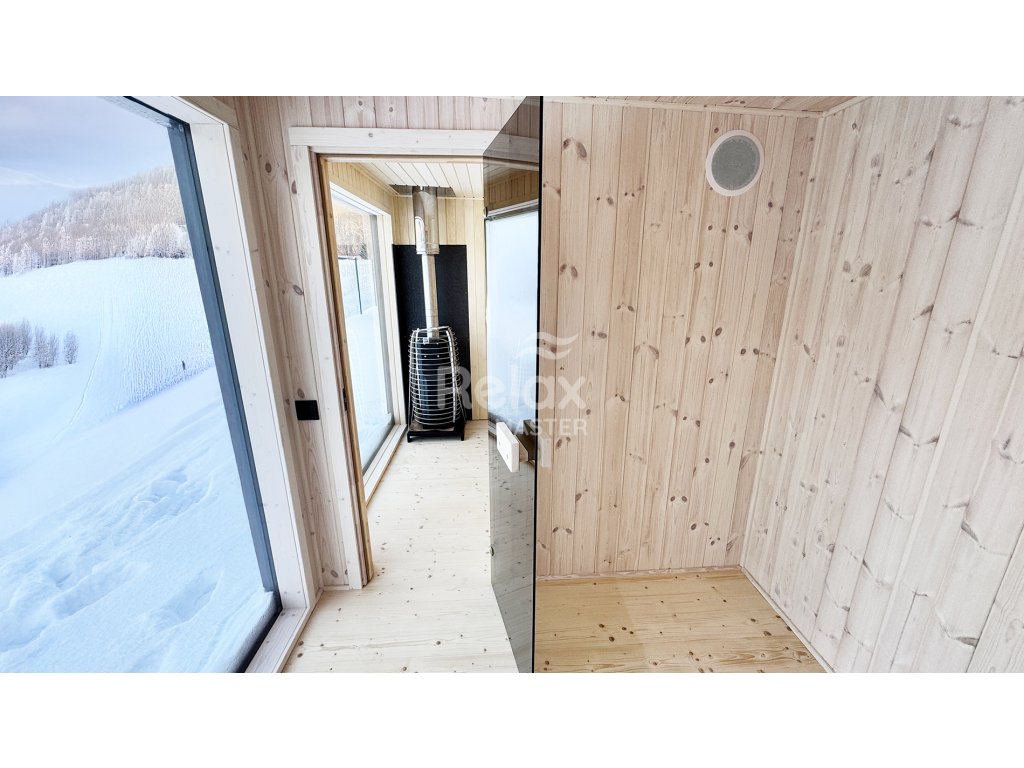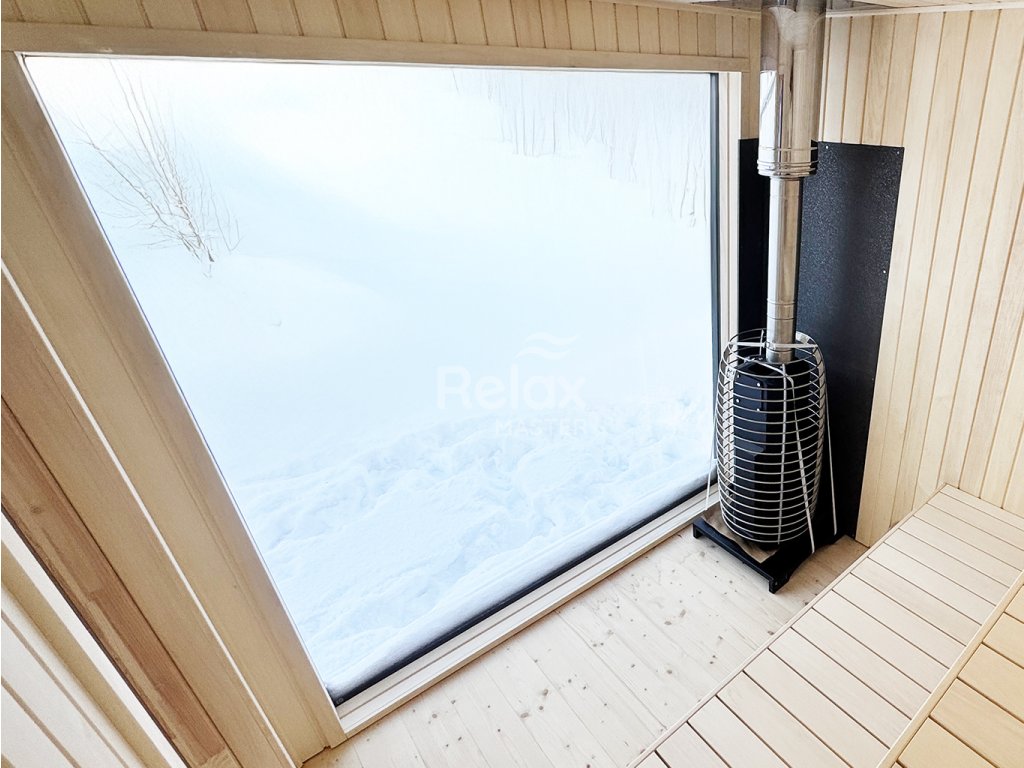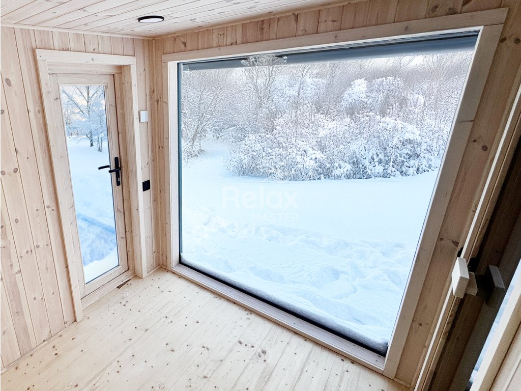 Sauna je vybavena dvěma panoramatickými okny z tvrzeného skla (200 × 195 cm) – jedno v sauně a jedno v předsíni. Dveře do sauny z tvrzeného skla a dřevěné dveře do předsíně s tvrzeným sklem podtrhují moderní vzhled a propouštějí dostatek denního světla.