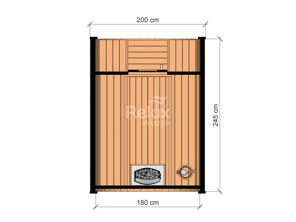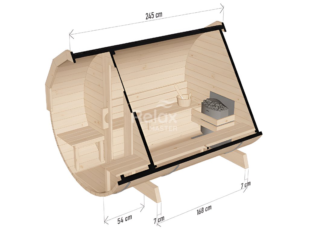 Kompaktné, no praktické rozmery – dĺžka 245 cm a výška 200 cm – poskytujú dostatok priestoru na spoločné saunovanie s rodinou či priateľmi. Súčasťou sauny je aj funkčná predsieň so strieškou a dvoma pohodlnými lavičkami, ideálna na oddych alebo ochladenie po saunovaní. Vstup zabezpečujú drevené dvere s tvrdeným bezpečnostným sklom.